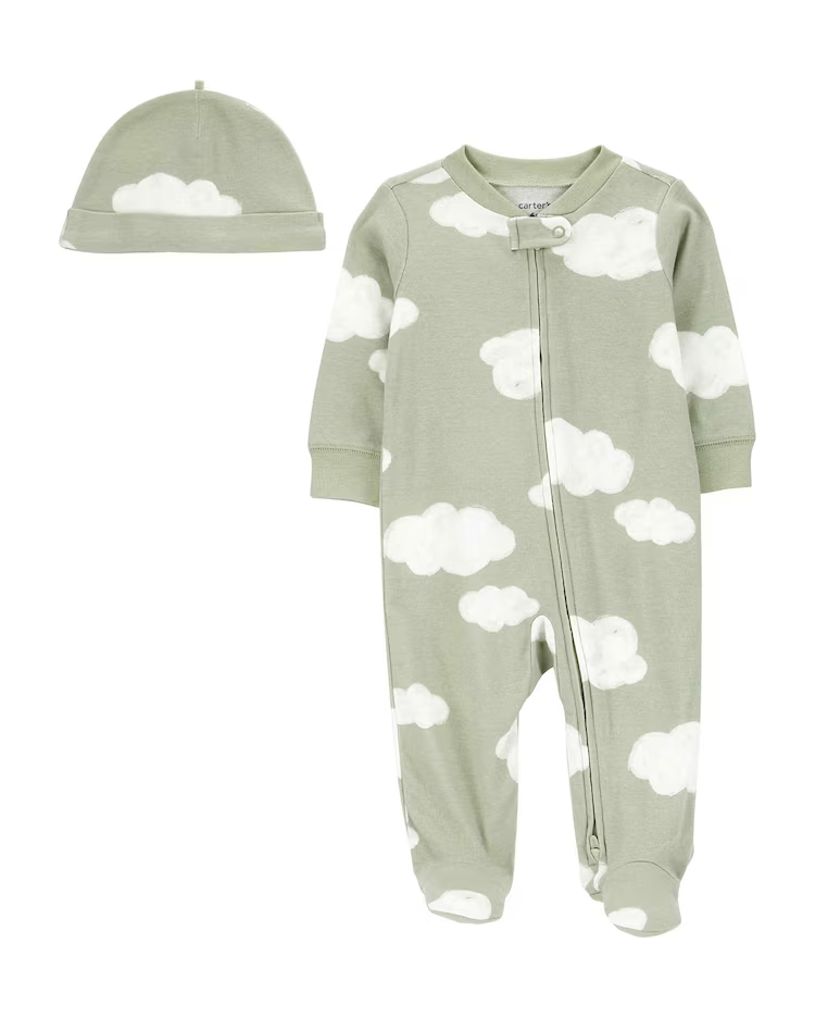 O Macacão bebê nuvens com touca verde | Carter’s confeccionado em material macio e aconchegante, com fecho frontal, zíper e manga longa. É ideal para todos os momentos. O modelo é ideal para as mamães que procuram por conforto e versatilidade na hora de trocar o bebê e ainda traz estampa delicada de folhas. Invista, seu baby merece!